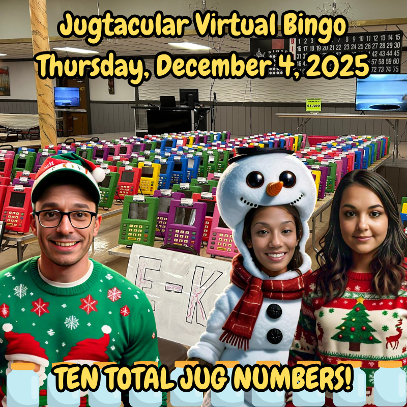 This is the virtual bingo session held at Center Stage on Thursday, December 4, 2025. We started the night with 10 total jug numbers and managed to give away three of them. 3-1 – Single Bingo $150 Angel Hurm 3-2 – Double Bingo $150 + Jug #6 Angie Burlew Karin Nadzam Melissa Olmeda Shaffer Sarah…