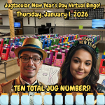 This is the virtual bingo session held at Center Stage on Thursday, January 8, 2026. We started the night with 5 jug numbers and didn’t give away a single one of them mostly because Jen is a bad caller. ๐ 3-1 – Single Bingo $150 Margy Olmeda Sarah Doby 3-2 – Double Bingo $150 John…