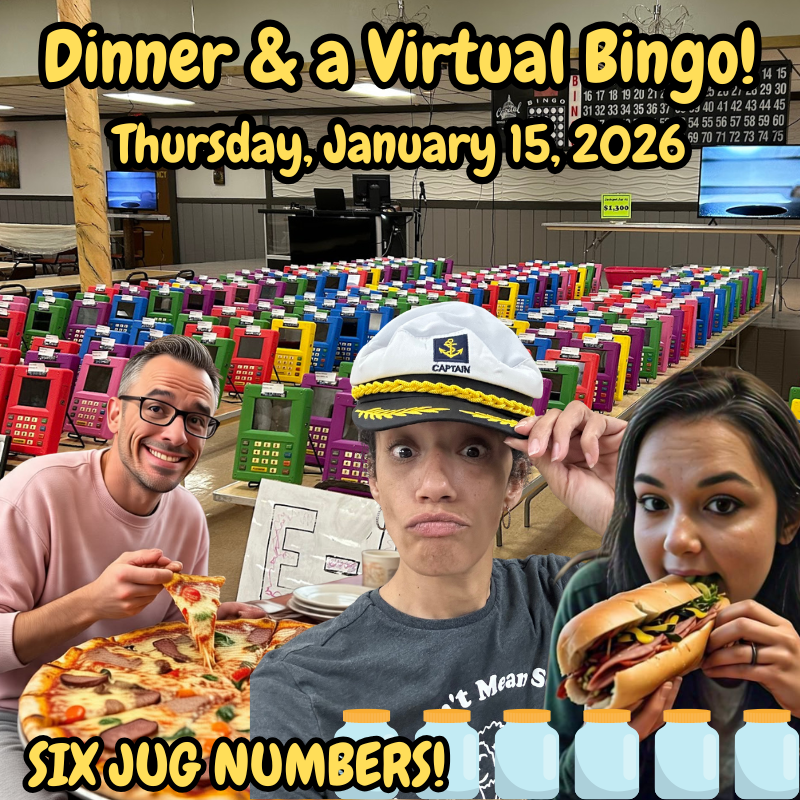 This is the virtual bingo sesion held at Center Stage on Thursday, January 22, 2026. We started the night with six jug numbers and managed to give away two of them along with FOUR deals! 3-1 – Single Bingo $150 Wendy Kryder RoseMary Weyand rose Fox Ric Ayersman Jean Curran Debi Mejia 3-2 – Double…