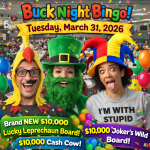 $1 NIGHT. $30,000 ON THE BOARDS. ZERO EXCUSES. 🤯 It’s BUCK NIGHT BINGO this Tuesday (March 31) and this is one of our biggest nights of the month… 💵 Upgrade ANY computer or paper pack for just $1💵 $1 SPECIAL PACKS all night💵 Tons of $1 kitchen specials AND we’re rolling in with THREE MONSTER BOARDS:🍀 Brand NEW $10,000 Lucky Leprechaun🃏 $10,000 Joker’s Wild🐄 $10,000 … [Read more...] about Buck Night is Back on Tuesday, March 31